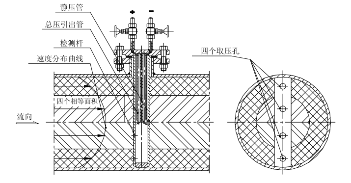 阿牛巴(均速管)流量計(jì)是基于皮托管測(cè)速原理發(fā)展起來的,它是通過管道的平均流速及管道的有效截面積的乘積來確定流量的。一般管道中的流速分布是不均勻的。如果是充分發(fā)展的流體,其速度分布為指數(shù)規(guī)律。為了準(zhǔn)確計(jì)量,將整個(gè)圓截面分成四個(gè)單元面積相等的兩個(gè)半圓及兩個(gè)半環(huán)。阿牛巴(均速管)流量計(jì)的檢測(cè)桿是由一根中空的金屬管組成,布置在垂直于流向的工藝管道中,迎流面鉆兩對(duì)總壓孔,分別處于各單元面積的中央,它們分別反映了各單元面積的流速大小。由于各總壓孔是相通的,傳至檢測(cè)桿中的各點(diǎn)總壓值平均后,由總壓引出管經(jīng)高壓接頭,送到變送器的正壓室。當(dāng)阿牛巴(均速管)流量計(jì)正確安裝在有足夠長(zhǎng)度直管段的工藝管道上時(shí),流量截面上應(yīng)沒有旋渦,整個(gè)截面的靜壓可認(rèn)為是常數(shù)。在檢測(cè)桿的背面中間設(shè)有一個(gè)檢測(cè)孔,代表了整個(gè)截面的靜壓。經(jīng)靜壓引出管由低壓接頭引至變送器的負(fù)壓室,正、負(fù)壓室測(cè)得的差壓的平方與流量截面的平均流速成正比,從而獲得差壓與流量成正比的關(guān)系。