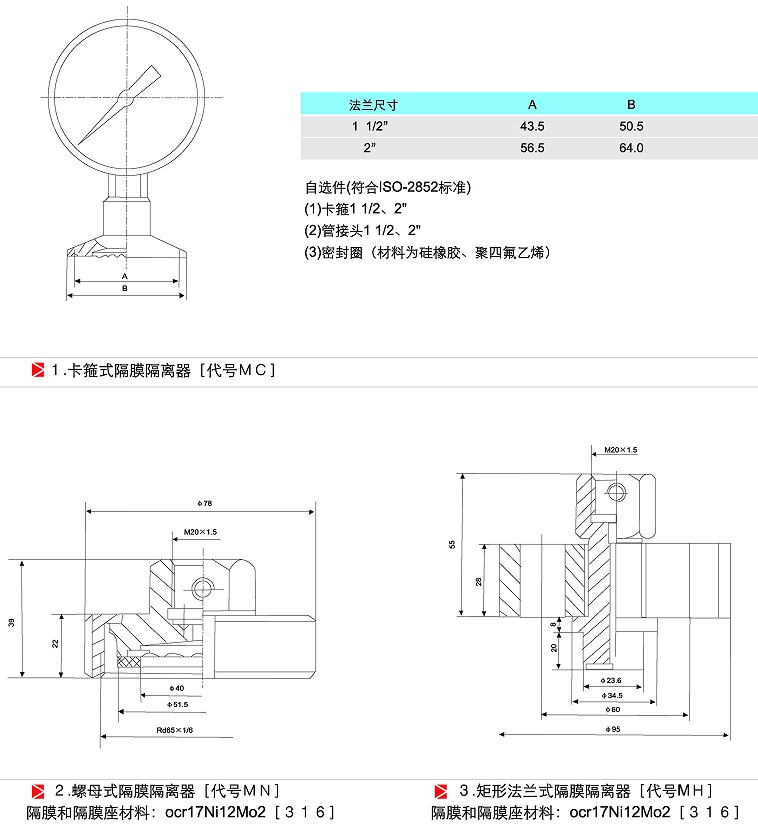 注:隔膜壓力表根據隔膜體連接方式不同不僅可以做成以上的螺紋連接、法蘭連接、衛生型卡盤連接,還可以做成管道式隔膜壓力表,管道式隔膜壓力表連接根據不同的安裝需要有卡盤式、螺紋式、對夾式等等。